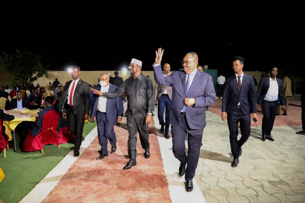 Garoowe: 18 November 2021: Madaxweynaha Dowladda Puntland Mudane Siciid Cabdullaahi Deni, oo uu weheliyo Madaxweyne Ku-xigeenka Dowladda Puntland Mudane Axmed Cilmi Cismaan Karaash ayaa caawa Qasriga Madaxtooyada kaga qeybgalay kulan Casho Sharaf ah oo loo sameeyay Madaxweynaha Jubaland Mudane Axmed Maxamed Islaam iyo wafdiga uu hoggaaminayo ee ku sugan Garoowe.