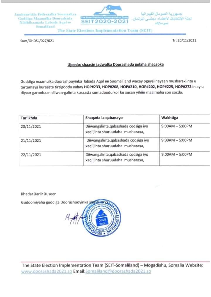 Jadwalka guddiga ay shaaciyeen ayaa lagu sheegay in 20/21/22 bishaan ay dhaceyso diiwaangelinta lix ka mid ah sagaal kursi oo horay guddiga u shaaciyeen in doorashadooda la diyaarinayo.