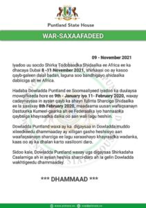 ” Puntland waxa ay ka digaysaa in Dowladda muddo xileedkeedu dhammaaday ay xilligan gasho heshiisyo aan waafaqsanayn sharciga ee lagu xaraashayo khayraadka wadanka, kaas oo ay ka dhalan karto xasilooni darro ayaaagu yiri” Qoraalka kasoo baxay Puntland.