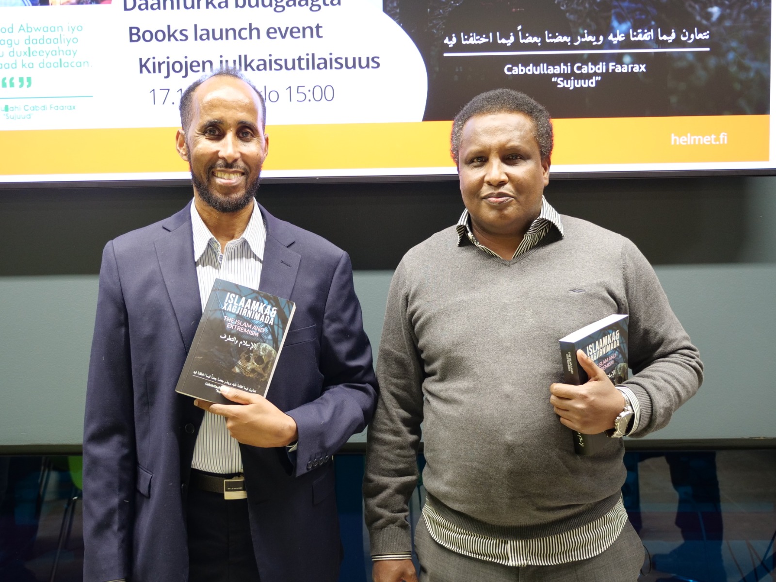 Maalinimadii shalay ayaa waxaa maktabadda weyn ee ku taal bartamaha magaalada Espoo, Finland lagu soo bandhigay labo buug oo isku mar soo saaray Qoraa Cabdullaahi Sujuud, sida ay qortay Warbaahinta Codka Soomaalida Finland ee Suomen Somali Media Verkosto.