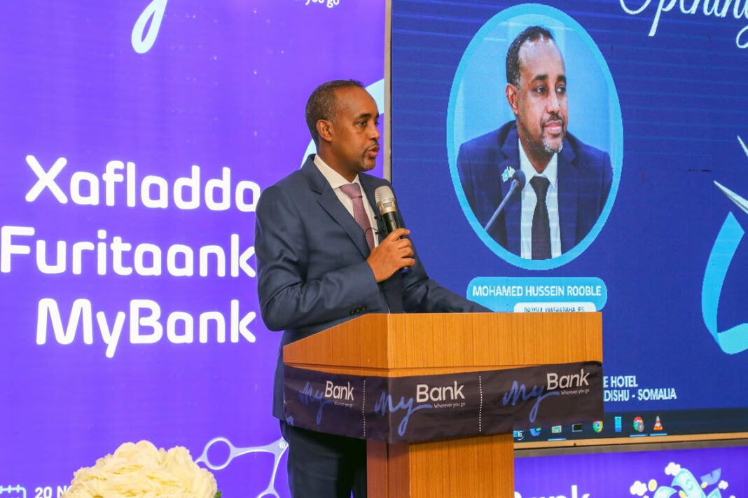 Muqdisho, Nofeembar 20, 2021; Ra’iisul Wasaaraha Xukumadda Federaalka Soomaaliya Mudane Maxamed Xuseen Rooble oo daahfuray Bangiga cusub ee My Bank oo ka mid ah bangiyadda gaarka loo leeyahay ee magaalada Muqdisho ayaa ugu baaqay ganacsatada Soomaaliyeed in ay u istaagaan samatabixinta dadkeenna la dhibaateysan abaaraha.