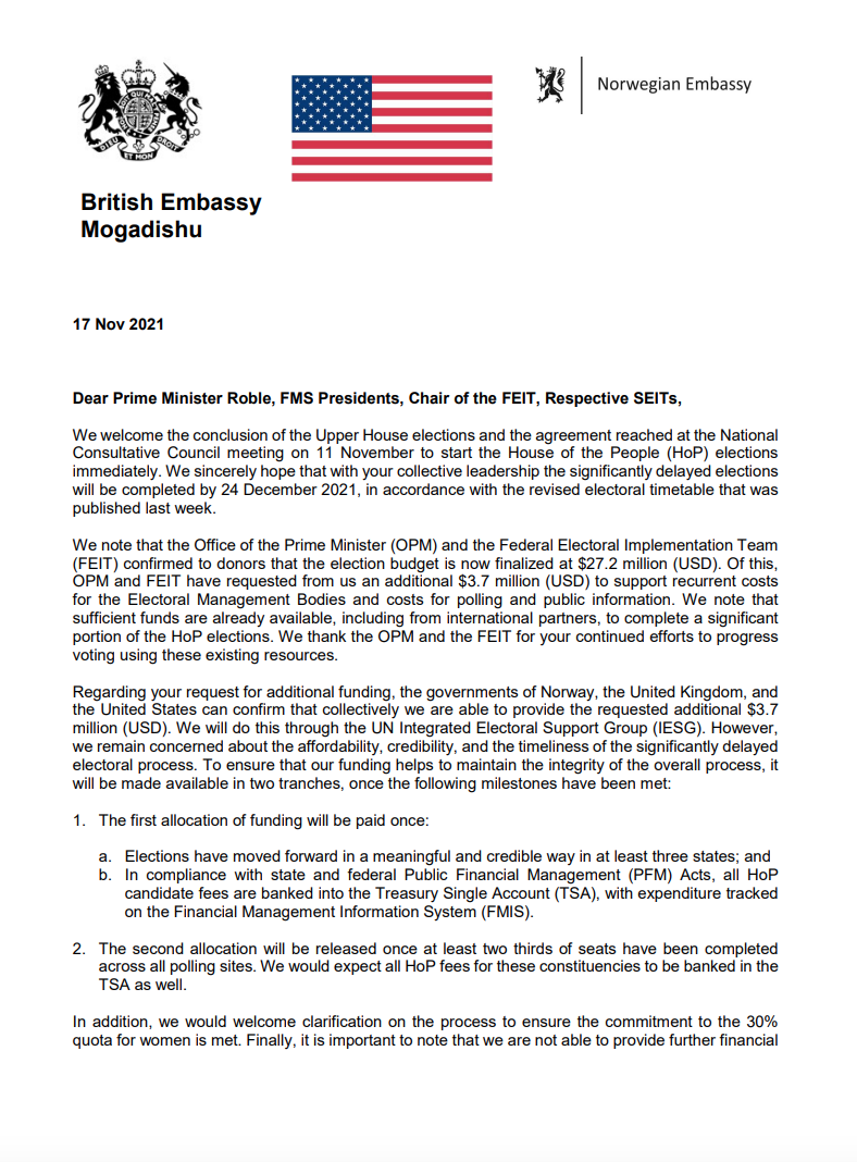 Mogadishu (Radio Maanta) Responding to a new request by Somali Prime Minister’s office for additional funding to the Horn of Africa’s electoral process, Norway, United Kingdom and the United States set two conditions to release any new funding.